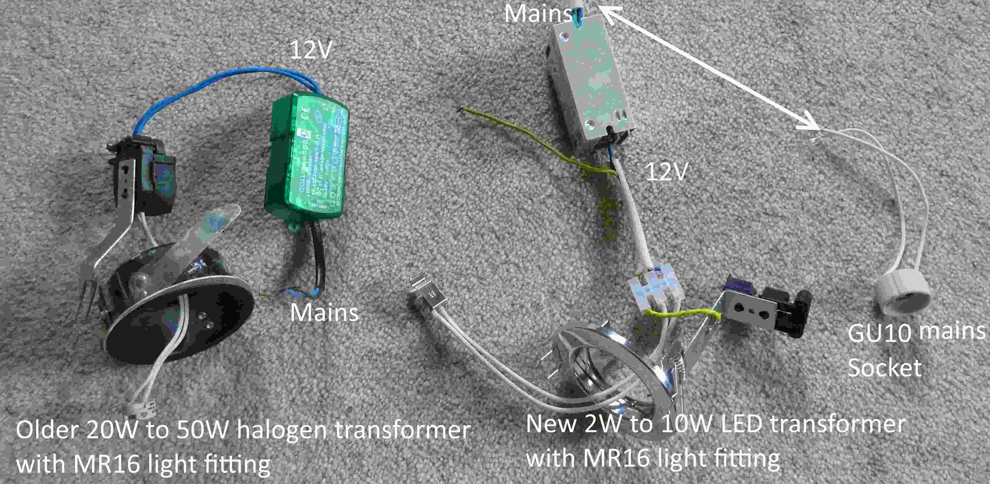 Your original transformer will probably look something like the one of the left, you then have a choice of replacing the transformer with an LED compatible transformer (middle, unwire 2 x 3 wire and rewire ~ £8 for transformer) or  to replace the MR16 socket with a GU10 mains socket and wire directly to the mains removing the transformer from the circuit altogether (unwire and rewire 1 x 3 wires £1 for socket, £0 or 1 for a junction box). If you run into this situation we are happy to provide advice.